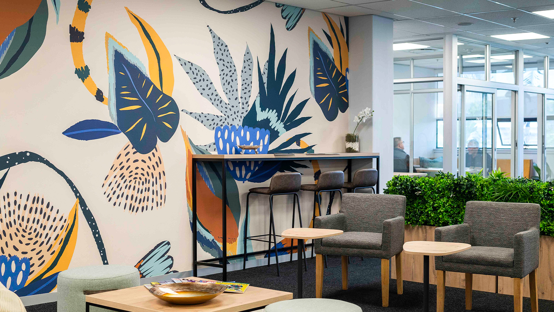 These bold, colorful leafy patterns were strategically placed to create striking focal points, enhancing the visual flow and infusing the space with a dynamic, yet cohesive aesthetic. The result is a beautifully curated environment that perfectly balances creativity and sophistication, elevating the overall office experience
