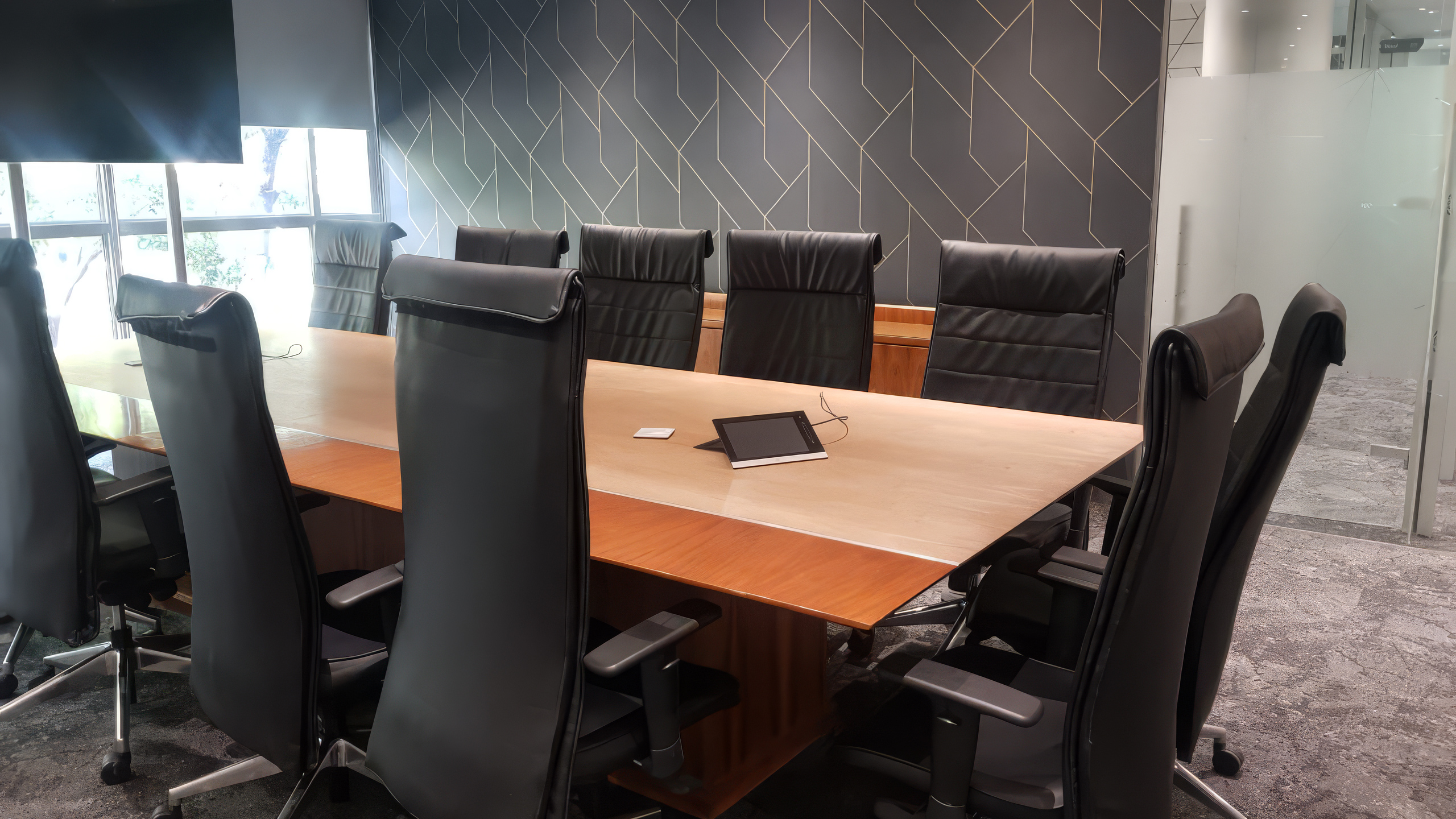 The main boardroom occupies a different register entirely. Here the same geometric language is expressed in deep charcoal with fine gold line detail — restrained, authoritative, and precisely calibrated to the weight of decisions made in the room. A warm oak boardroom table and black leather executive chairs complete a space that communicates gravitas without coldness. The wallcovering is the single most important decision in the room. It is what elevates it from a functional meeting space to a room that commands respect.