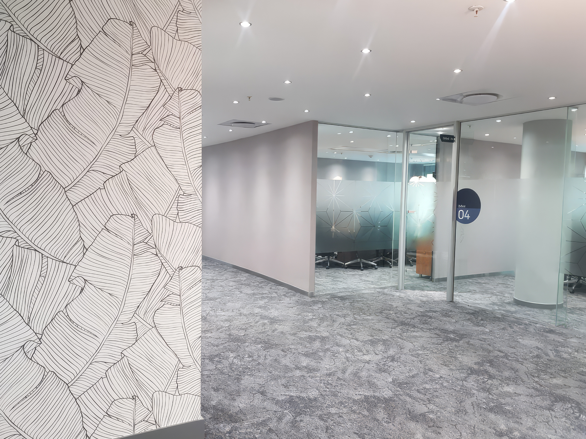 Threading through the geometric energy of the individual rooms, the circulation corridor takes a completely different approach. A large-format fine-line botanical mural — dense banana leaf forms drawn in precise black line on a white ground — wraps the curved corridor wall from floor to ceiling. It moves through the space at human pace, creating a moment of calm and organic contrast against the bold geometry of the rooms it connects. This is a designer decision that shows complete understanding of the floor as a whole: the botanical mural is the breath between the colour.