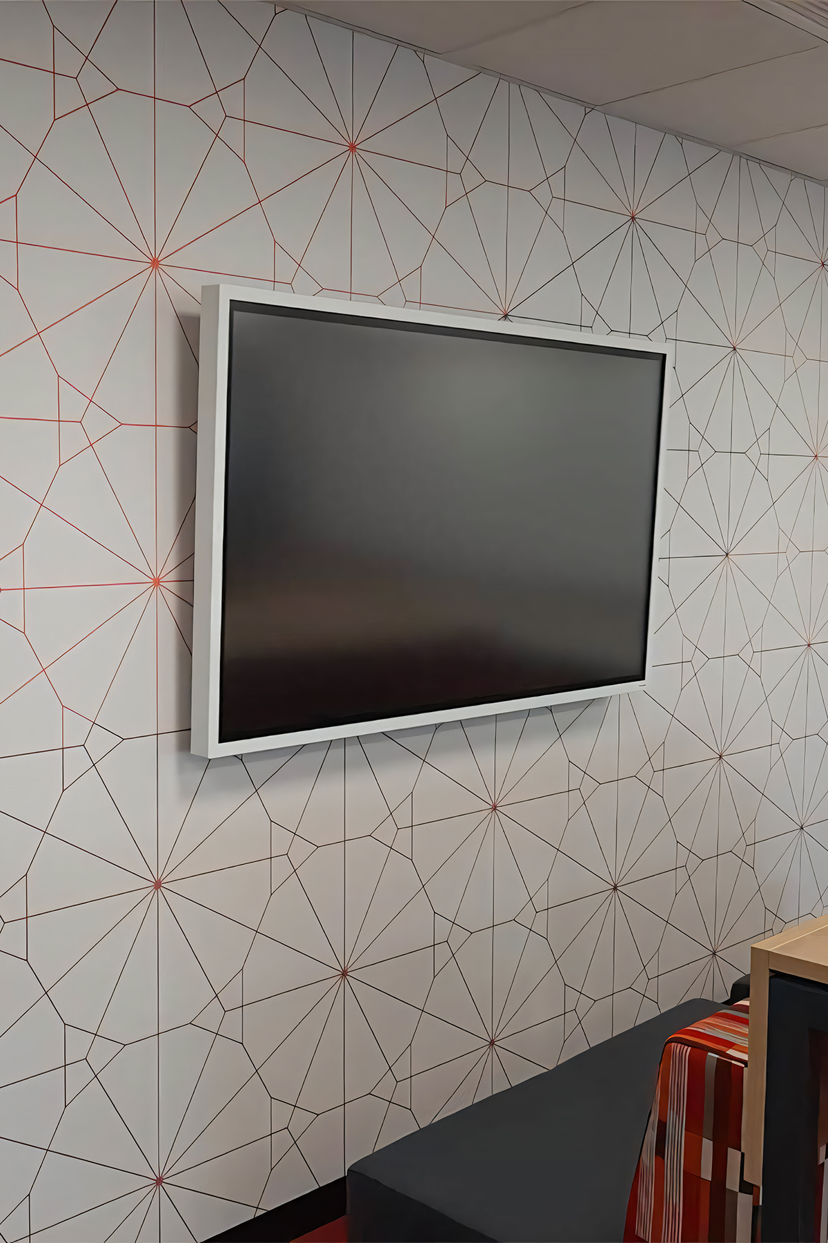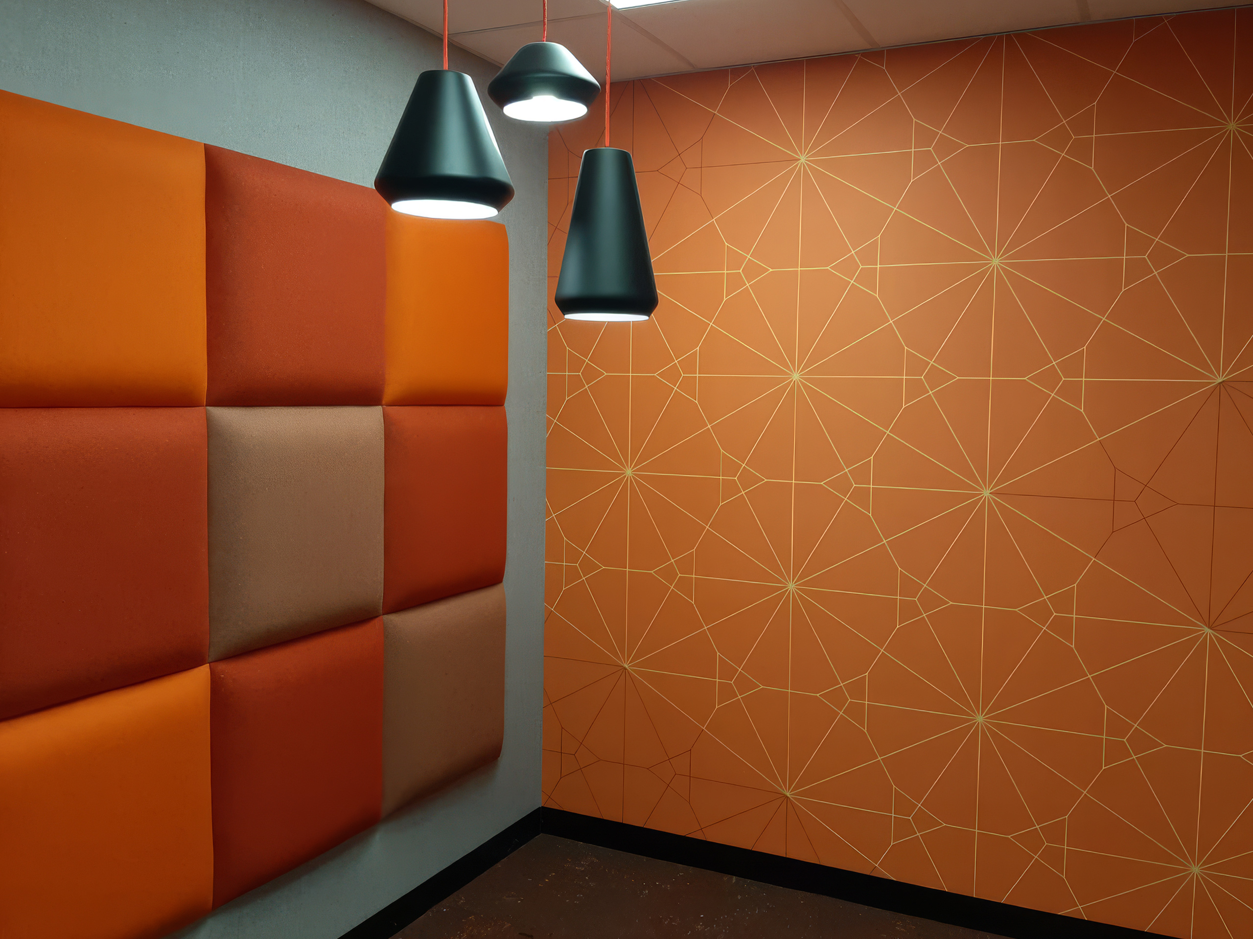 Across the suite of meeting rooms, four colourways of the same geometric design create four entirely different room personalities. A vivid magenta energises a private focus room. A deep burnt orange with gold line detail — paired with matching acoustic panels and black conical pendants — anchors a dynamic breakout lounge. A white and pale grey version with fine red line detail frames a presentation room where a large screen sits directly on the wallcovering surface. In each case the colourway sets the emotional register of the room before a single person enters it.