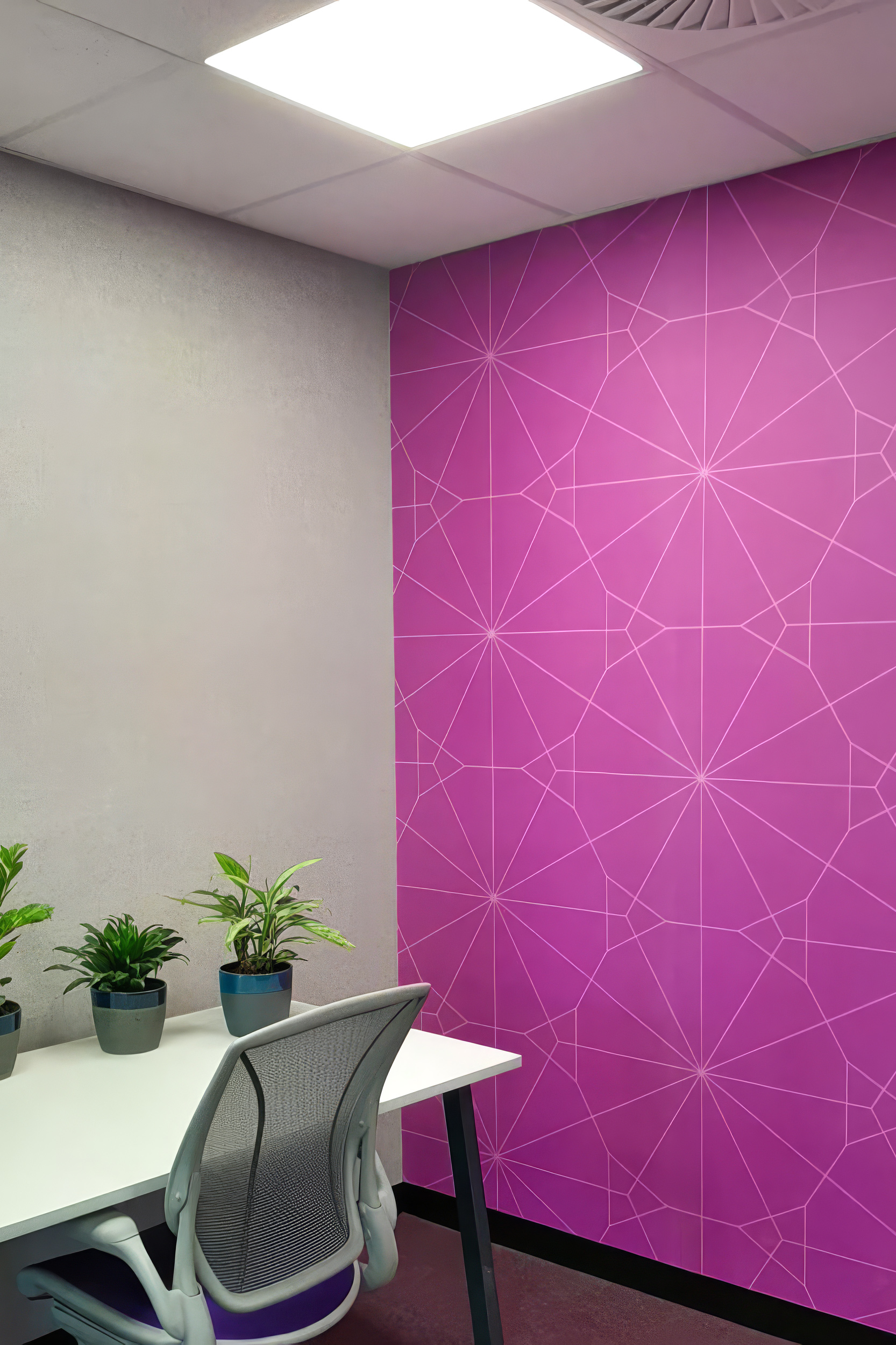 What makes this project exceptional is that the wallcovering decisions were not made room by room. They were made as a system. A family of geometric wallcovering designs — all sharing the same crystal star and constellation line vocabulary — was deployed across the floor in a deliberate colour-coding strategy: each meeting room, breakout zone, and collaboration space given its own distinct colourway from the same design DNA. Walk the floor and the wallcovering tells you where you are. This is wallcovering as wayfinding — spatial identity communicated entirely through surface.
