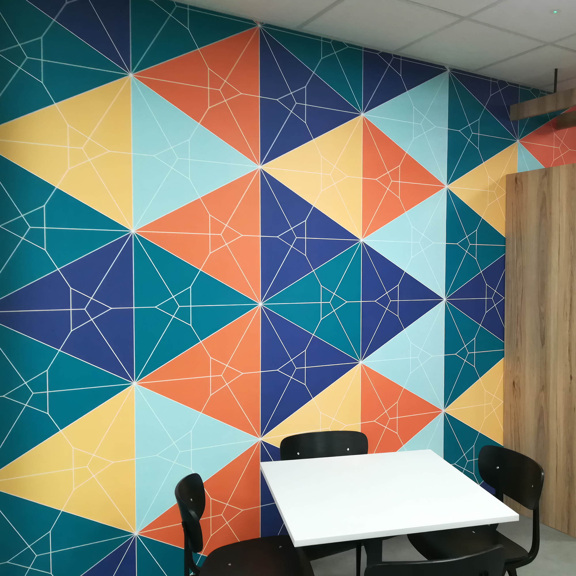 In the primary breakout and informal meeting zone, the full colour ambition of the project is expressed without restraint. A large-scale kaleidoscopic geometric mural — teal, navy, coral-orange, pale yellow, and light blue in bold triangular forms with white constellation line overlay — wraps a corner of the space in a composition of extraordinary visual energy. This is the room that communicates the organisation's personality most directly: confident, contemporary, and entirely unafraid of colour. The wallcovering does not decorate this space. It defines it.