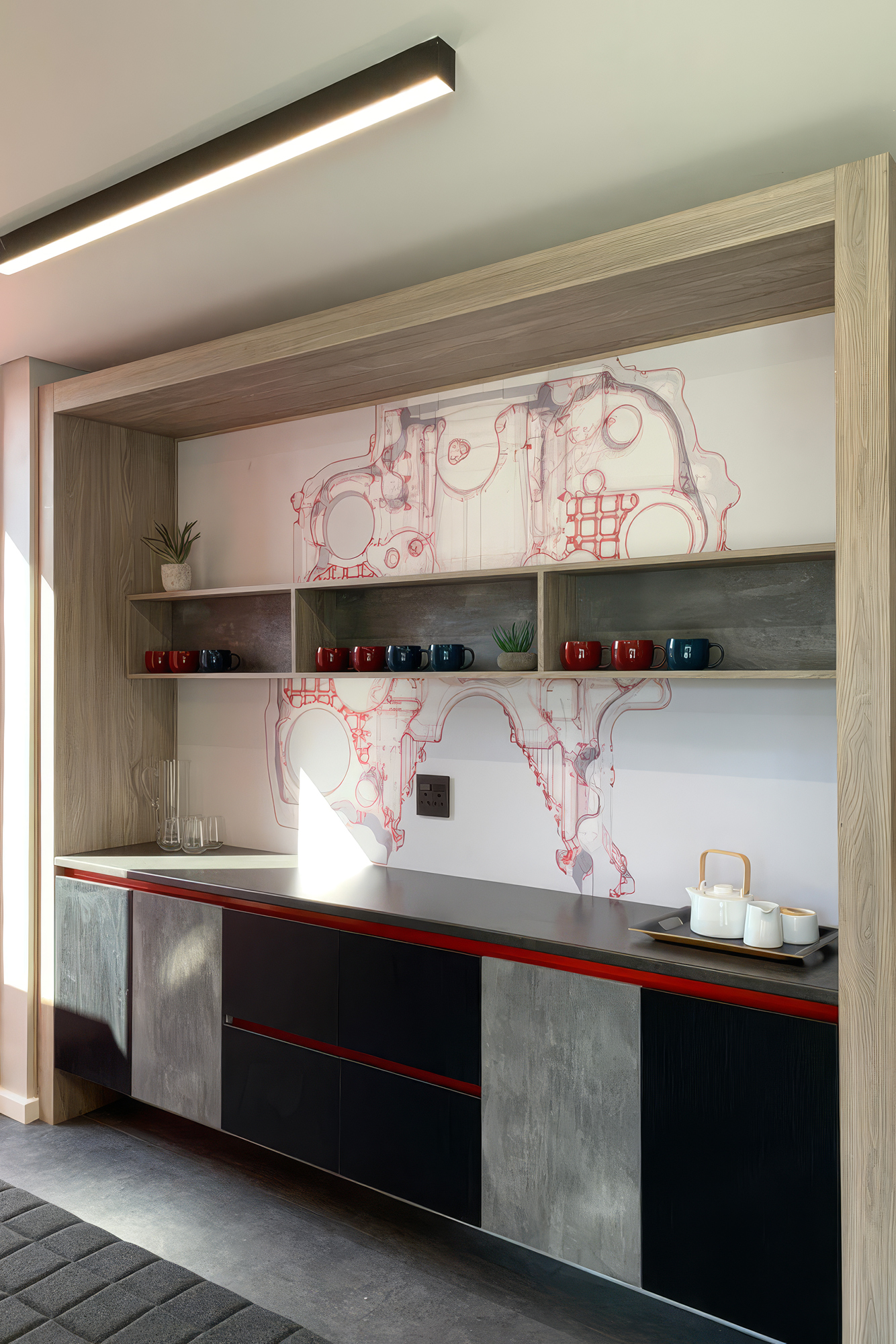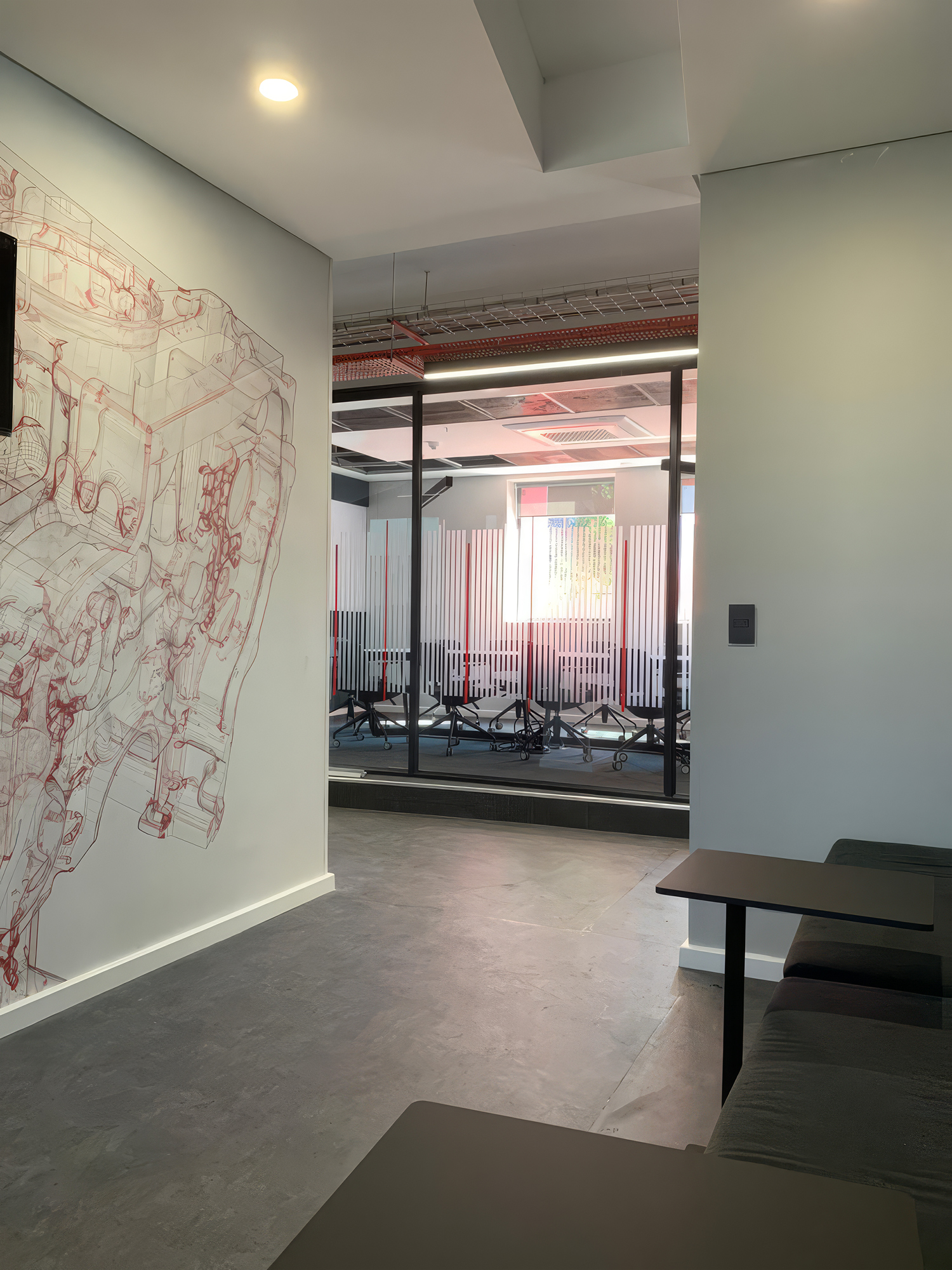 What Urban Spaces demonstrates in this project is an uncommon design skill: the ability to translate an organisation's intellectual identity into physical space. The technical illustration mural is not a generic choice from a wallcovering catalogue. It is a specific decision made for a specific client — a surface that says something true about who they are and what they do. That specificity is what elevates this fitout beyond the functional and into the genuinely expressive. The wall carries the brief.