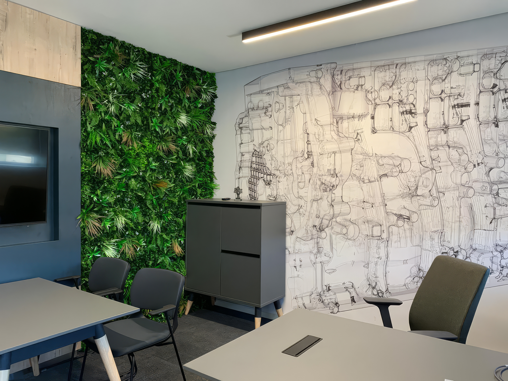 Against the technical precision of the illustration murals, Urban Spaces places a lush living green wall — dense tropical foliage in palm fronds, ferns, and flowering plants covering a full wall panel in the meeting room. The contrast is deliberate and arresting. The drawn mechanical world and the living botanical world face each other across the same room. The tension between them is not a design problem to be solved. It is the design. It communicates that this is an organisation that holds complexity and nature in the same frame.