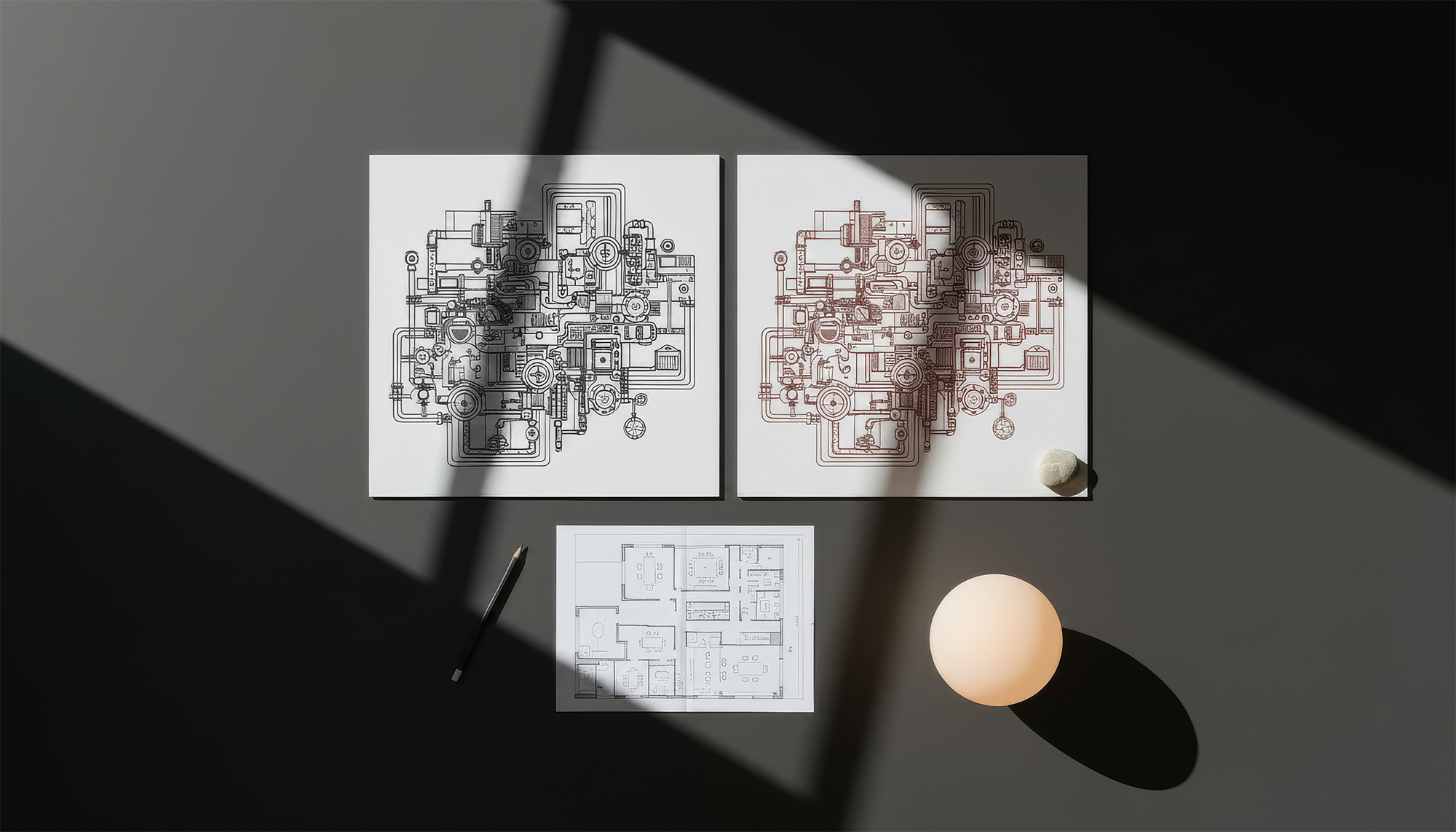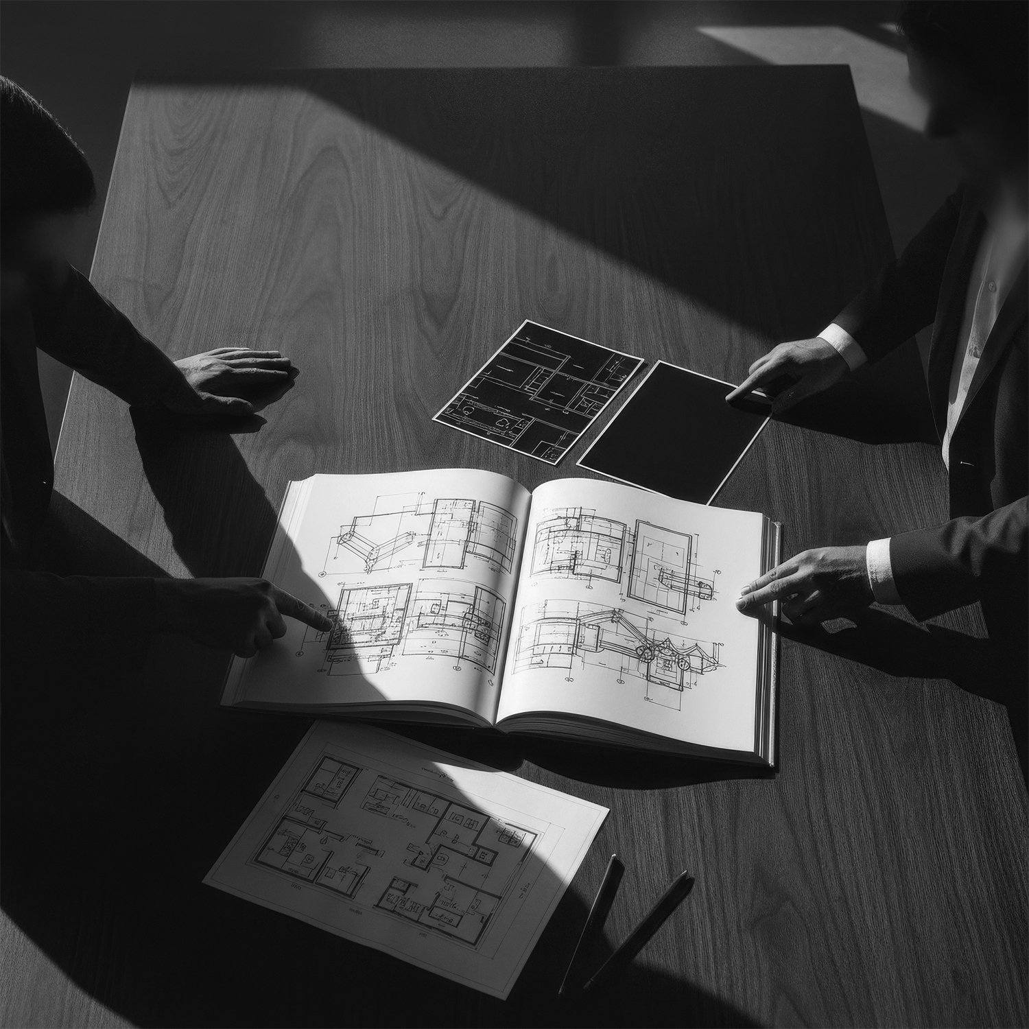On the meeting room feature wall, a large-format technical illustration mural wallcovering covers the full surface in dense fine-line mechanical drawing — complex overlapping engineering forms, pipe systems, machinery components, and architectural isometric views rendered in precise black line on a white ground. This is not a decorative choice. It is a declaration. The organisation that inhabits this space thinks in systems, builds complex things, and has the confidence to put the evidence of that thinking directly on its walls. The mural communicates expertise before a word is spoken.