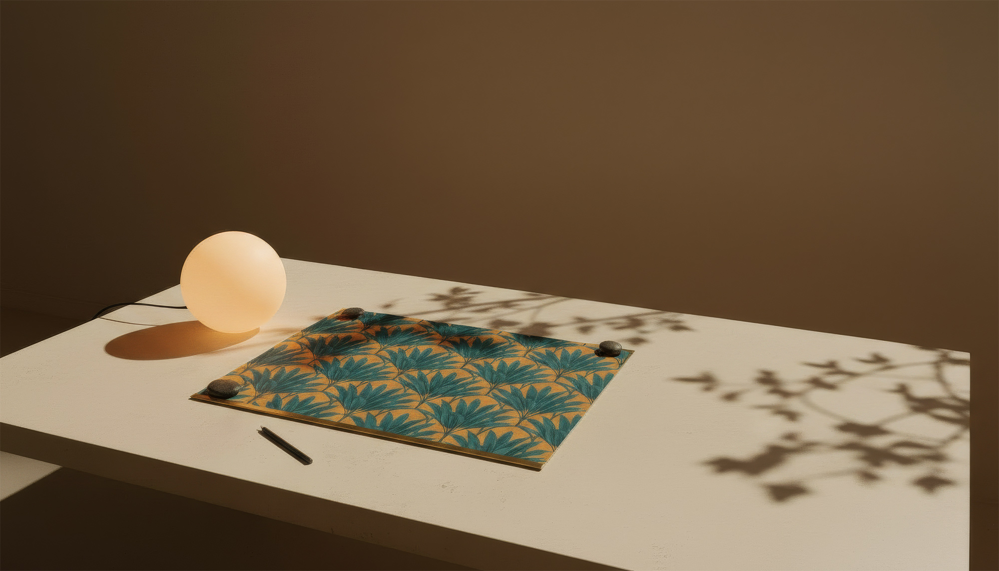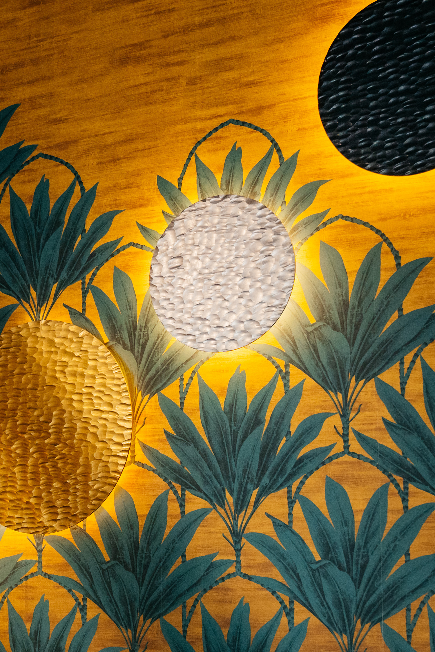 Gaiduk’s most arresting design decision was what she placed against the wallcovering, not on top of it. Three large circular woven-texture disc sculptures — one in warm natural straw, one in bleached white, one in deep charcoal — are mounted directly into the botanical field, each one backlit with a halo of warm amber. They read as celestial bodies: three moons at different phases rising from the teal canopy. The relationship between the woven discs and the woven-grain wallcovering ground is not coincidental — the amber tones echo and amplify each other, while the textural kinship between disc surface and wall surface makes the two feel like a single designed system. The wall is never background here. It is the sky these moons inhabit.