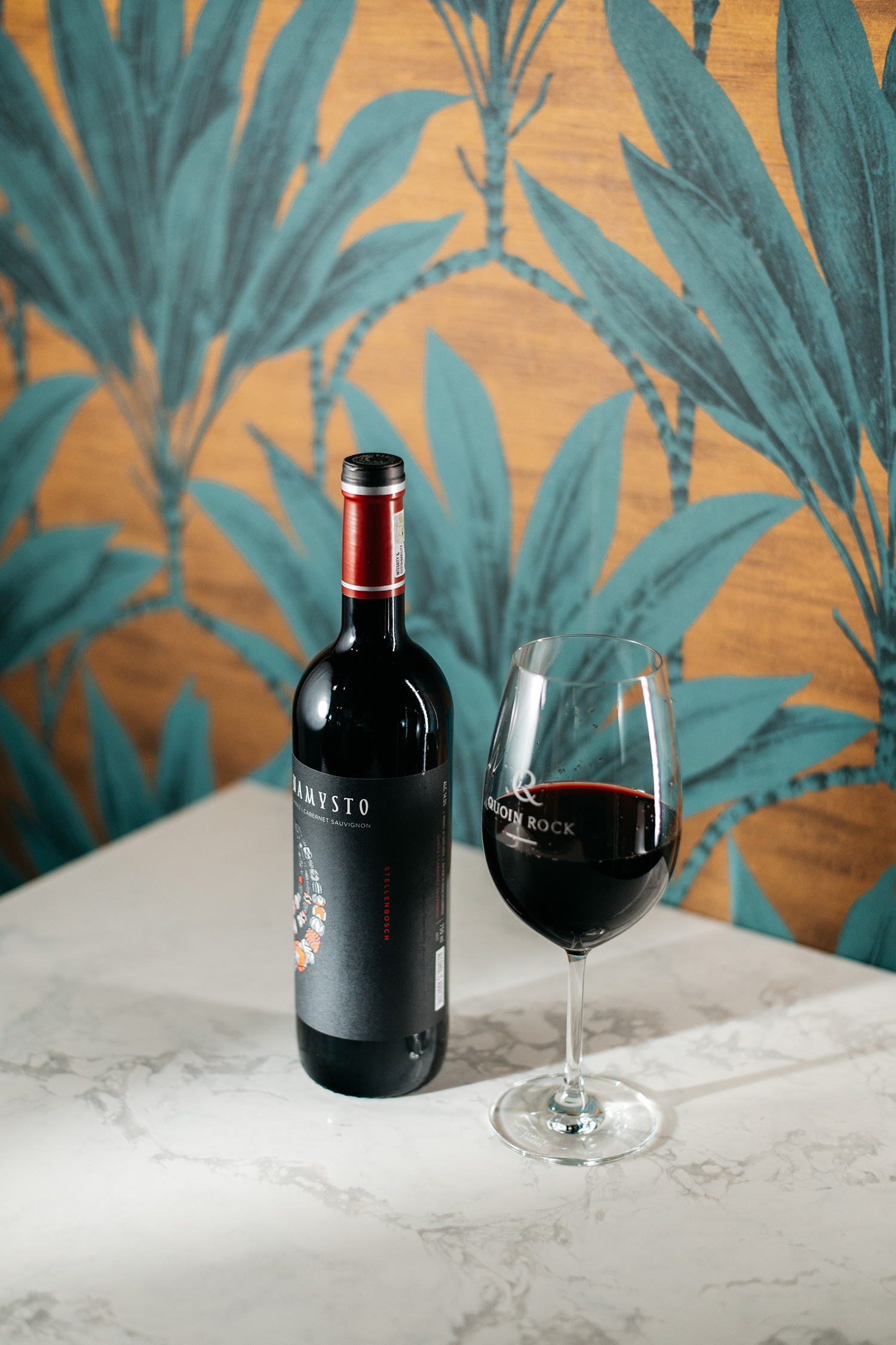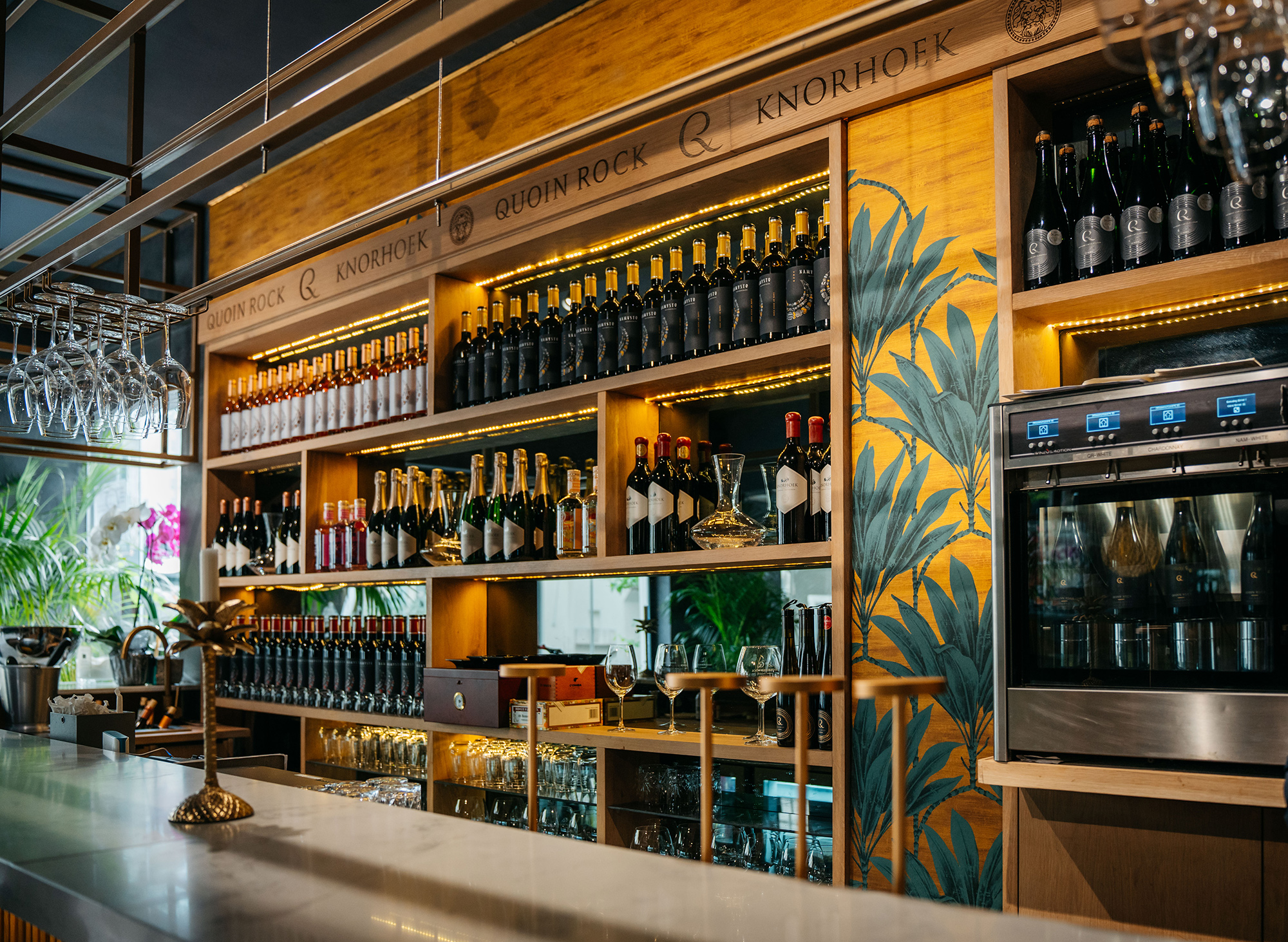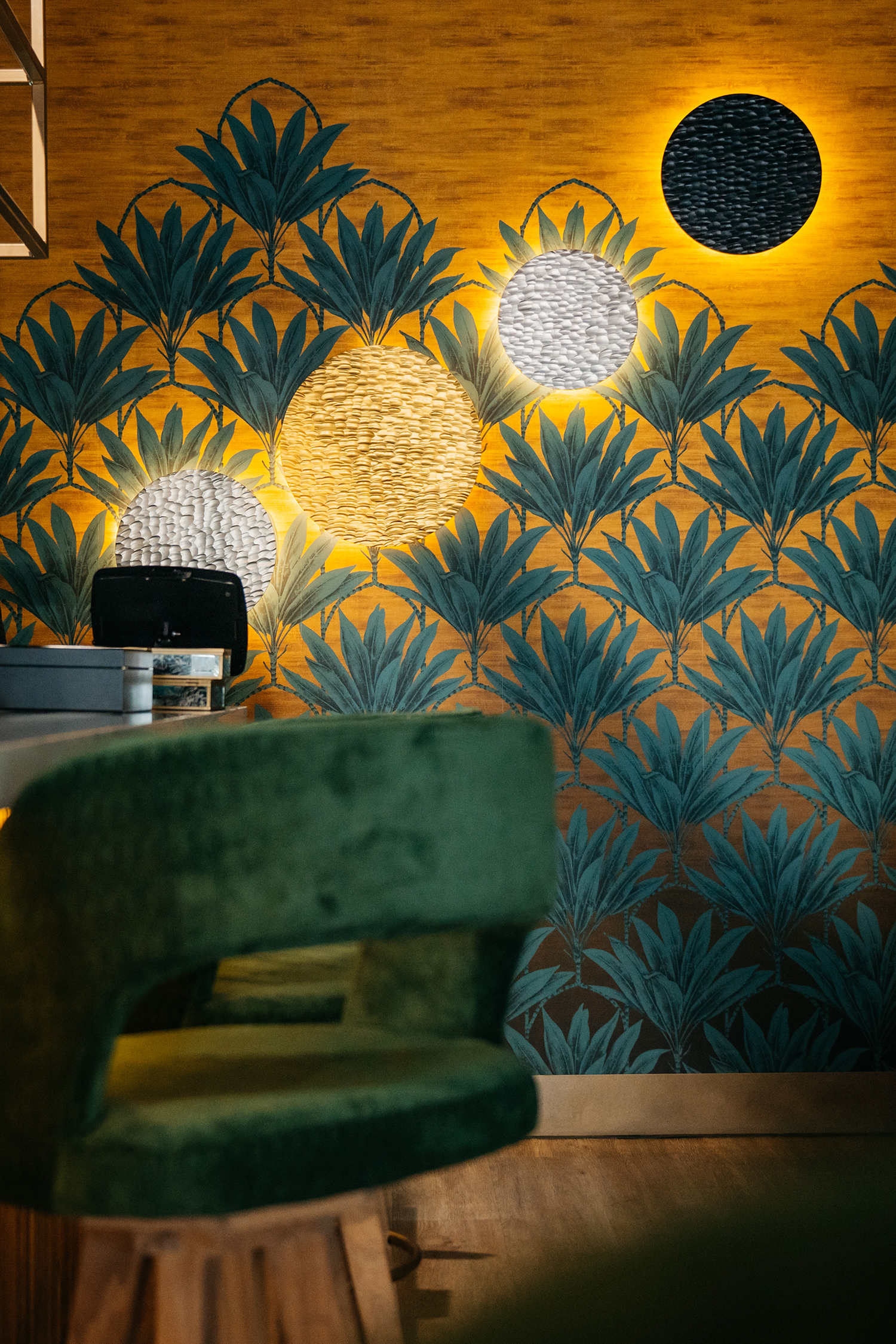 There is a moment, when you walk into QBar in Stellenbosch, where the room announces itself before anything else does — before the wine list, before the marble bar top, before the forest-green velvet of the stools. The wall announces it. Yuliya Gaiduk's design for this wine bar is built around a single, definitive wallcovering decision: a large-scale tropical botanical on a ground of deep amber that reads like burnished honey, like the inside of a barrel, like late afternoon light through a glass of Chenin. It is the architecture of atmosphere made visible, and every other material choice in the room flows from it.