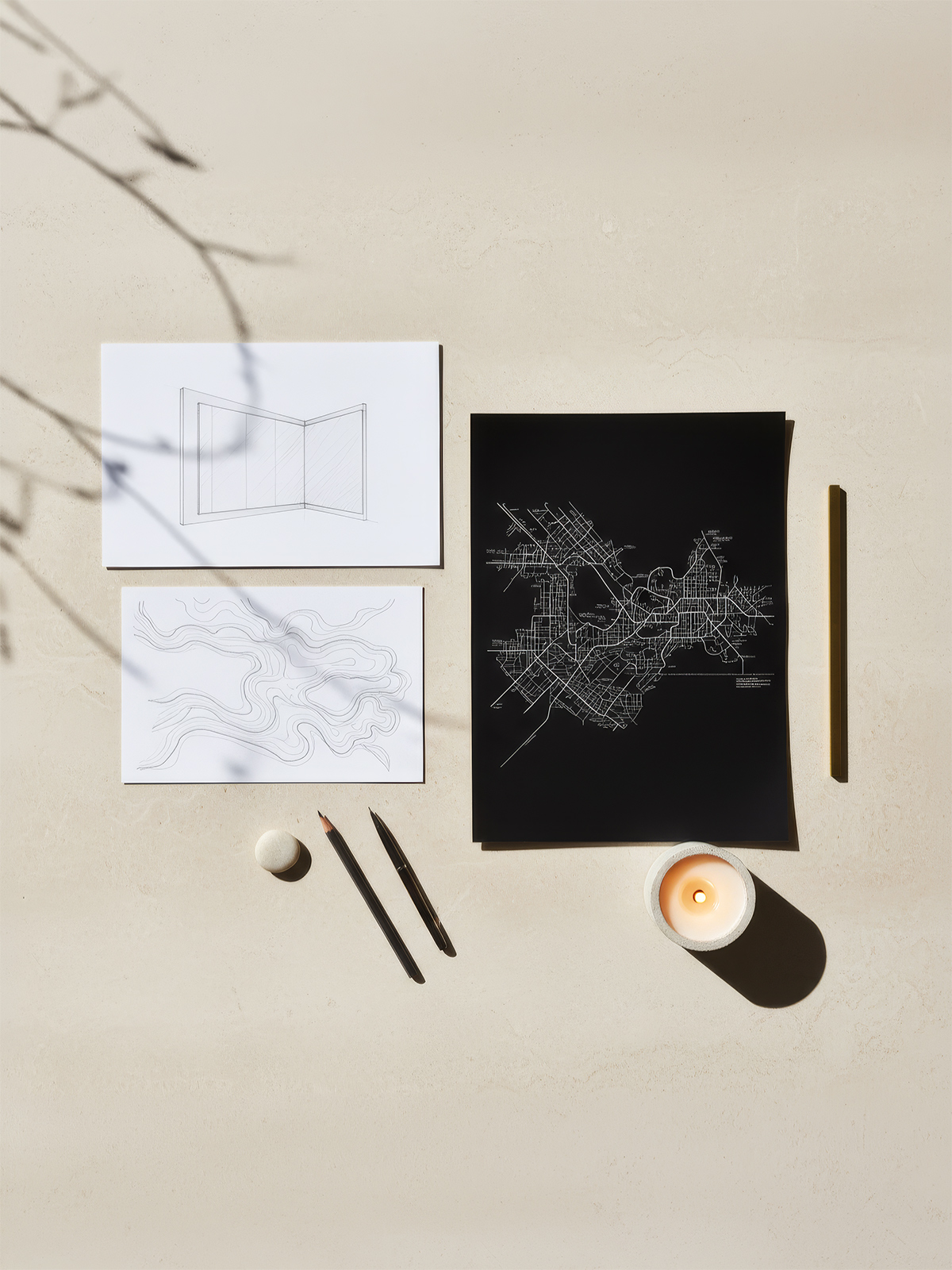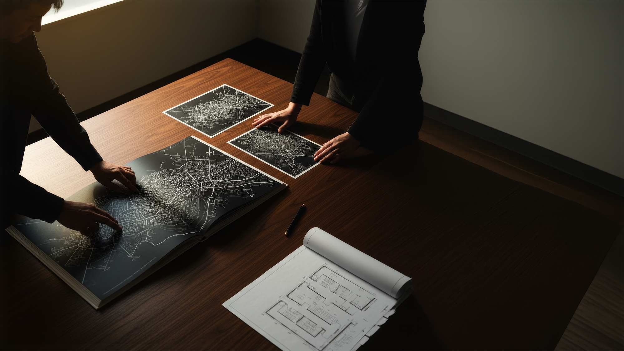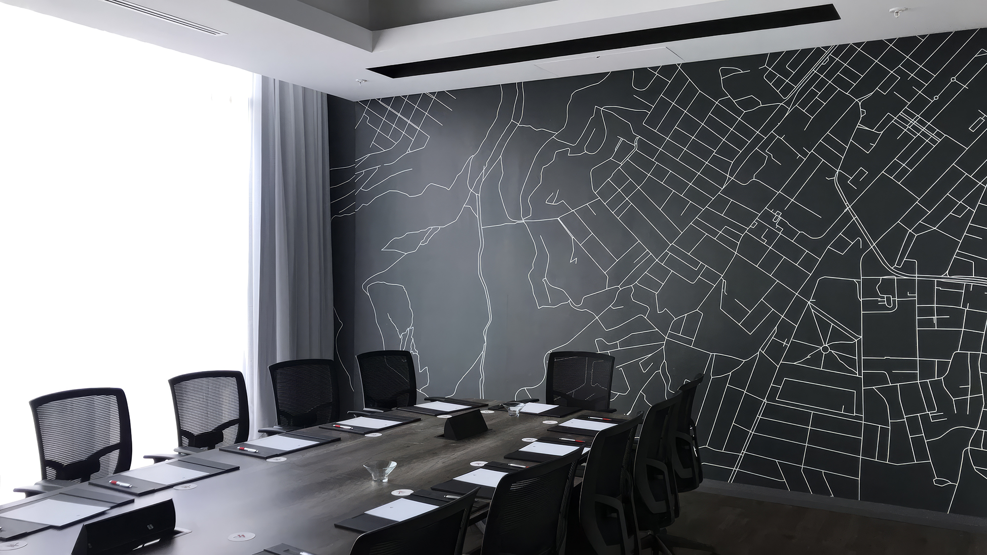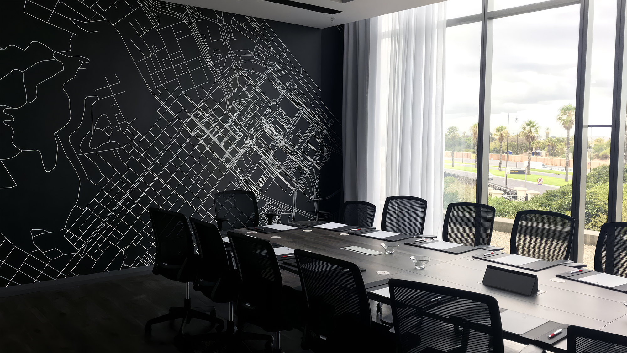 The most powerful design moment in the room is the relationship between the wallcovering and the windows. The map on the wall depicts the city. The windows show the city. From the boardroom table, the executive sees both at once — the abstracted cartographic representation of the place, and the place itself. The dark mural and the bright daylight from the glazing create a balanced visual tension that gives the room a sense of openness and gravitas in equal measure. The wallcovering is what makes this dialogue possible.
