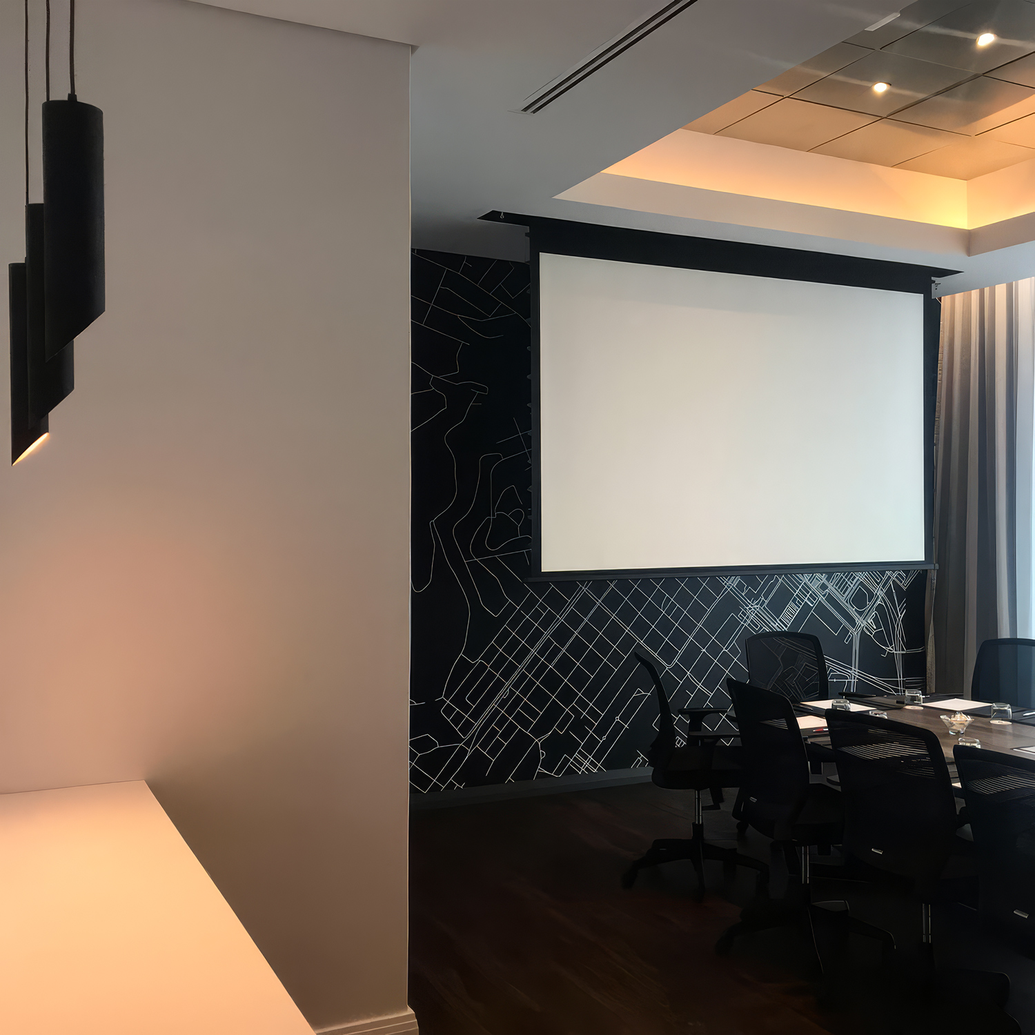 The wallcovering's authority is amplified by the absolute restraint of the room around it. A long dark fumed oak boardroom table, black mesh executive chairs, simple black leather writing pads with red-accent pens at each setting, full-height curtained glazing opening to the city beyond. A recessed coffered ceiling with warm amber cove lighting. Nothing competes with the map. Everything supports it. This is the mark of a designer who understood that when the wallcovering is doing the work of the room, the rest of the design must defer to it.
