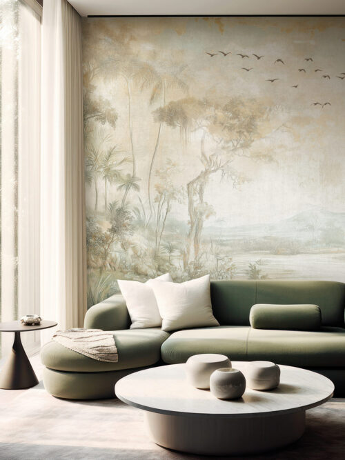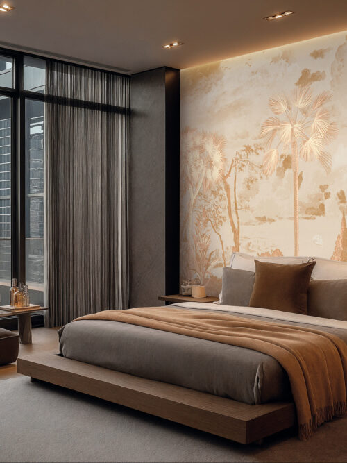 “Whispering Palms brings ethereal botanical elegance into sophisticated spaces. Delicate palm silhouettes drift across a tranquil backdrop, balancing organic movement with minimalist refinement—perfect for luxury spa suites, coastal homes, and serene hospitality lounges. Custom printed to your wall’s precise dimensions for a seamless, tailored installation.”