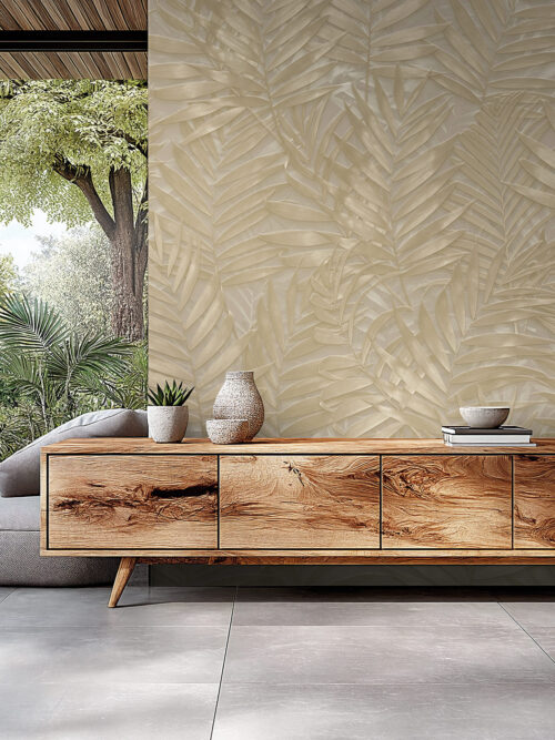 “Palm Reverie drifts with graceful tropical silhouettes softened in refined tones; perfect for serene luxury hospitality and biophilic-inspired homes. Tailored to exact wall size.”