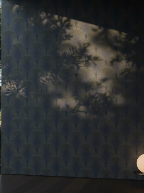 “Art Deco grandeur reinterpreted through a darkly sophisticated lens. Interlocking fan forms cascade across a deep midnight ground in tonal gold and navy, their obsessive linear precision creating a surface of extraordinary richness. Exceptional in hotel bar environments, private members clubs, and the formal rooms of residences where drama and restraint coexist.”