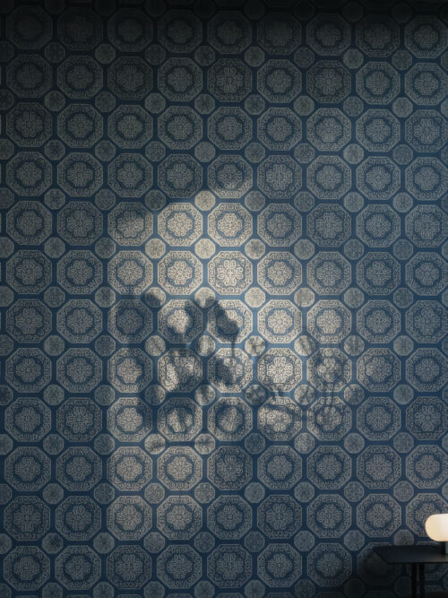 “An opulent field of Moorish-inspired medallions, each one unique in its intricate detailing, set against a rich cobalt ground threaded with gold. The cumulative effect is of a surface that rewards extended contemplation. Spectacular in hotel dining rooms, cultural hospitality venues, and the reception rooms of residences that honour craft and heritage.”