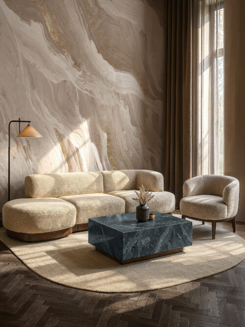 “Marble Escape is a sculptural interpretation of carved stone, softly layered with atmospheric depth. A sophisticated choice for statement walls in luxury residences, spas, and hotel lobbies. Custom printed to your exact wall dimensions, ensuring perfect alignment and natural scale.”