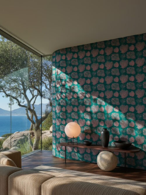 “Coral sea fans in warm blush-rose repeat across a deep teal ground, each specimen rendered with delicate organic branching. The ocean-floor narrative is vivid yet composed, making this an exceptional choice for coastal resort properties, boutique hotel bathrooms, and the dining rooms of homes with a love of the natural world.”