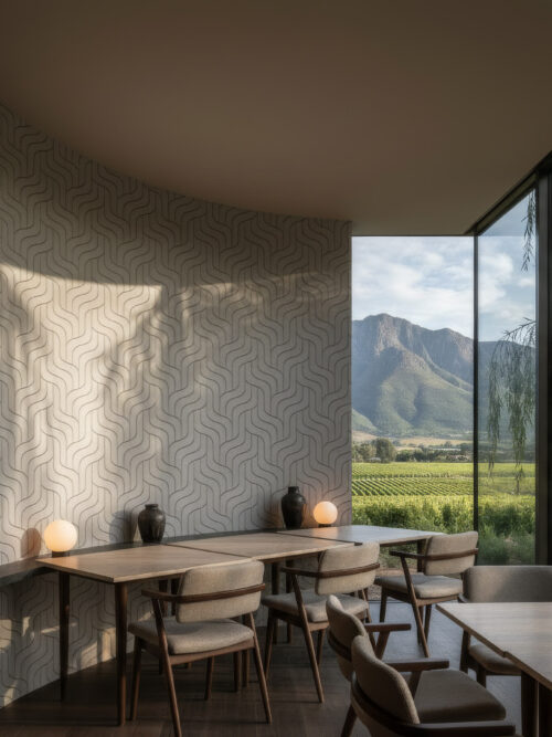 “Sinuous S-curves interlock in a tonal chalky ground with quiet, hypnotic rhythm. The near-tonal palette keeps the pattern refined rather than demanding, lending movement to a wall without sacrificing calm. Ideal for corporate interiors, hotel bedroom feature walls, and residential spaces where geometry is felt rather than announced.”