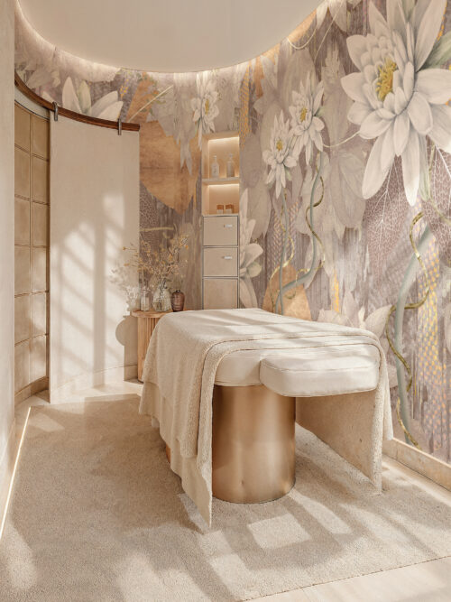 “Whispers of Lilies renders delicate florals with exquisite restraint. It graces spa treatment rooms, boutique hotel corridors, and residential bedrooms where femininity meets quiet luxury.”