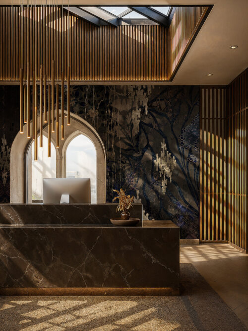“Intricate medallion geometry unfolds across a warm stone ground in a whisper of tonal contrast. The ornamental detailing carries the richness of Islamic architectural tradition, reinterpreted for the contemporary interior. Refined and quietly opulent — a natural choice for hotel lobbies, spa environments, and the formal rooms of discerning residences.”