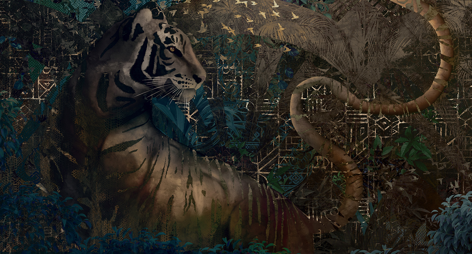 “The Hunting Party design showcases to power of the bengal tiger with this contemporary focal element. In a dark green, dark brown and black colourways, this exceptional wallcovering would make a feature wall in a hotel bedroom or lobby. Each of the designs from the new Muance Amber collection is printed on high quality vinyl substrate and suitable for hospitality, commercial, office and residential interiors. All the Muance designs are custom printed to your wall size(s), so send us your measurements for a quote.”