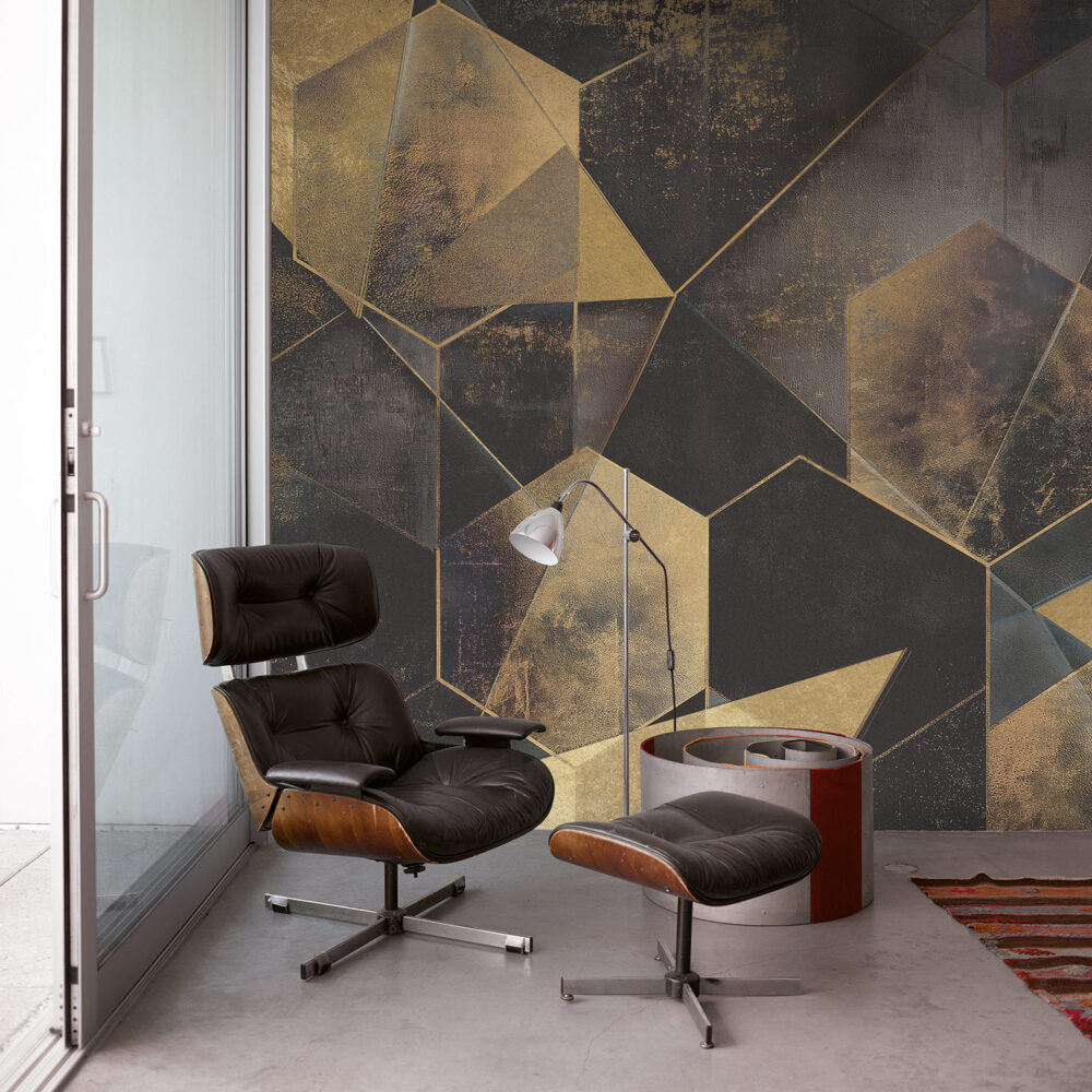 “Noir Geometry merges dramatic tone and structured form for sophisticated, modern interiors. Custom printed to your wall’s exact scale.”