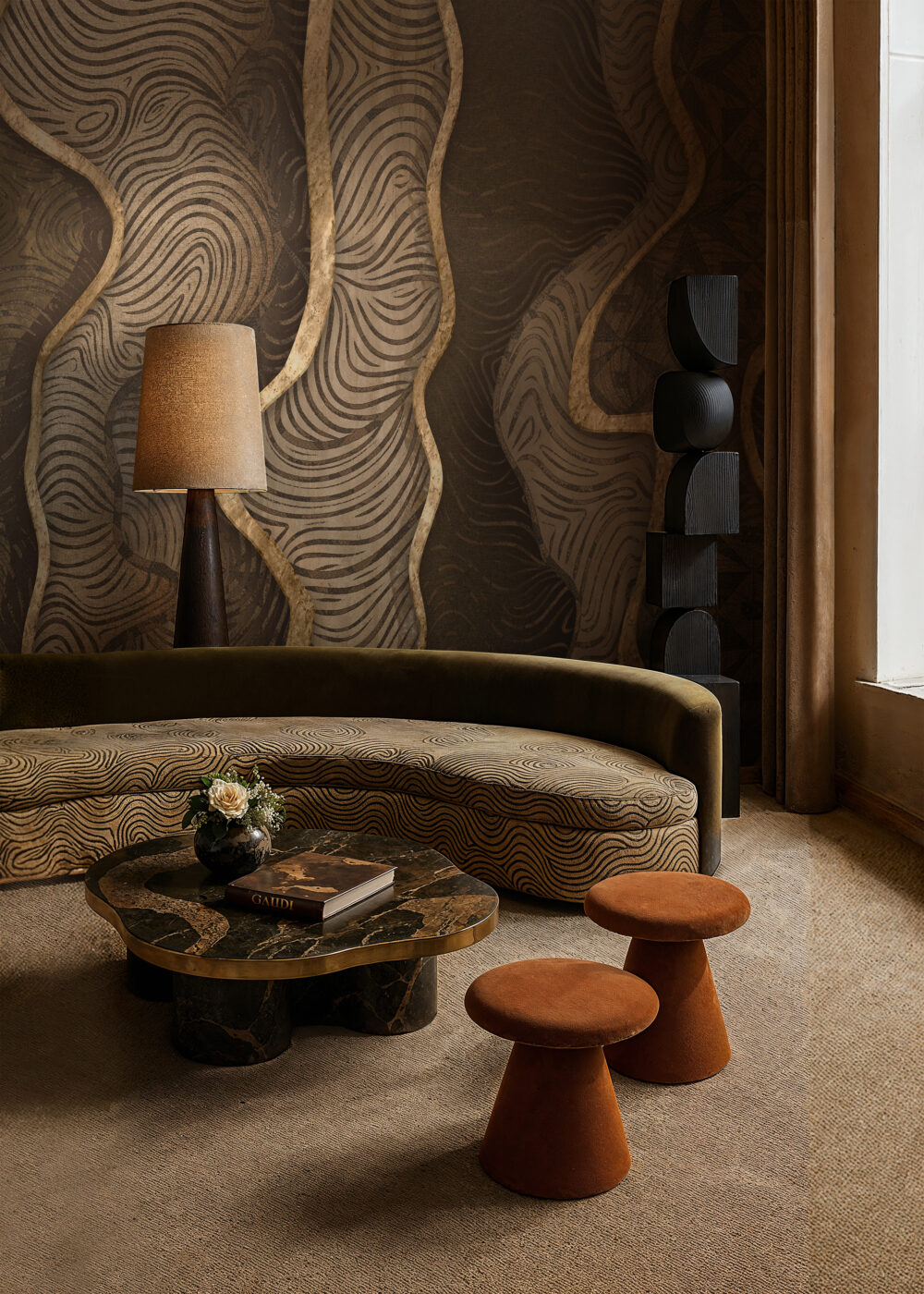 “Named for Jupiter’s moon, Elara carries quiet celestial grace. A sophisticated companion for hotel spa reception areas, bedroom feature walls, and the sitting rooms of understated luxury homes.”