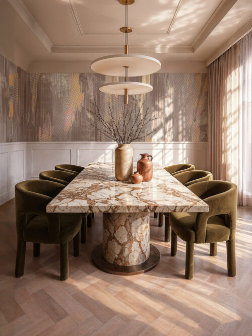 “Layered reveals depth upon depth, like geology made visible. It rewards close inspection, making it a compelling choice for intimate hotel dining rooms, private studies, and carefully considered residential interiors.”