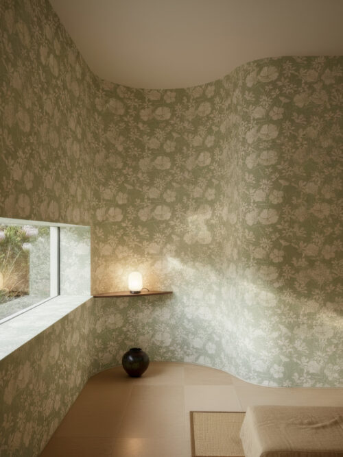 “No less striking is the ZANZIBAR design. The group of paradise islands that give their name to this motif conjure up images of sunshine, heavenly beaches and coconut trees, inspiring Guido Maria Kretschmer to create a wallpaper that is both discreet and captivating. The motif looks like something from a distant world, where exotic plants pick up the motion of the sea, shimmering gently on the wall with a wave-like appearance.”